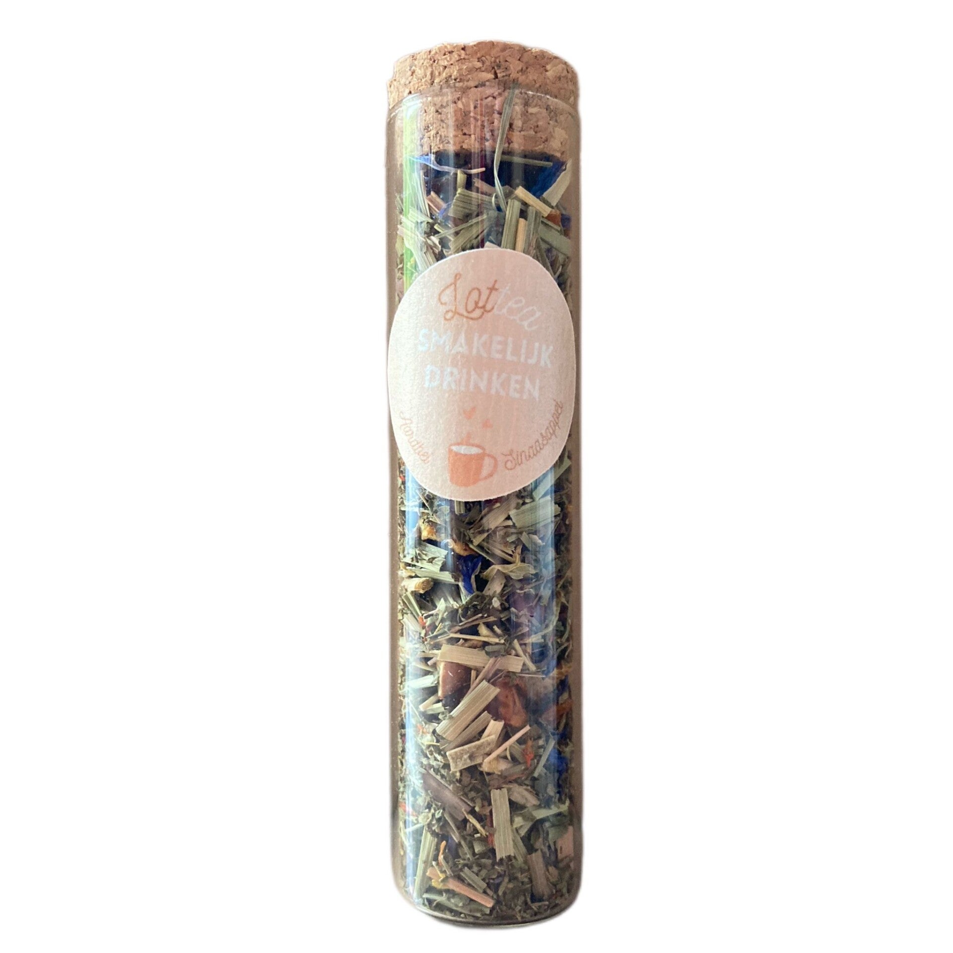 Het theetje "Smakelijk drinken" is een heerlijke thee op basis van kruiden. Door de frisse en lichte zoete smaak, zal deze thee in de smaak vallen bij kinderen. De "Smakelijk drinken" thee is een echte kinderthee, wat wil zeggen dat deze thee geen cafeïne, toegevoegde suikers of toegevoegde smaakstoffen bevat.