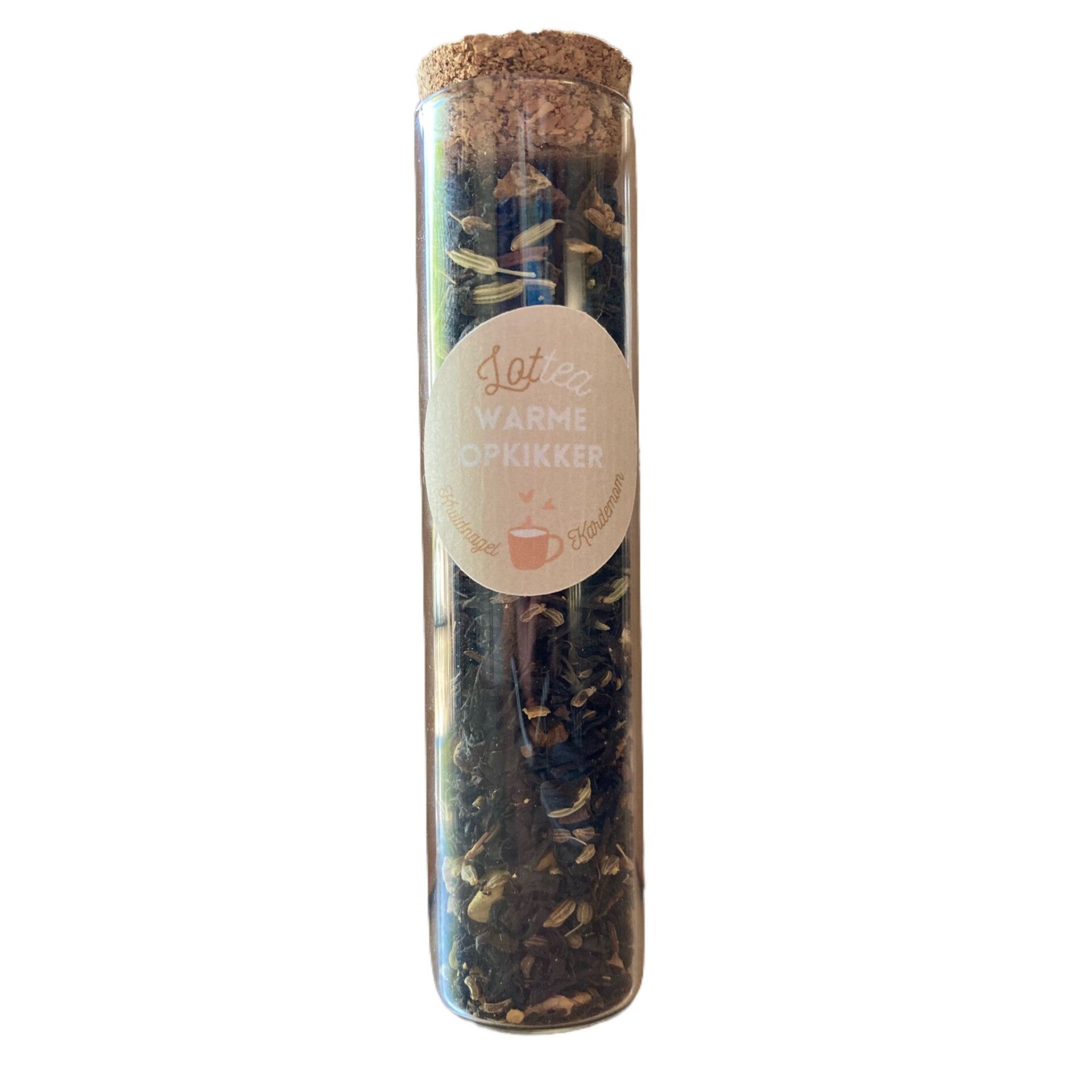 Het theetje "Warme opkikker" is een kruidige, intense Chai thee met kaneel stukjes, anijs en kruidnagel. "Warme Opkikker" thee heeft als basis Zwarte Thee Ceylon, een theesoort die door velen gewaardeerd wordt om zijn diepe aroma.