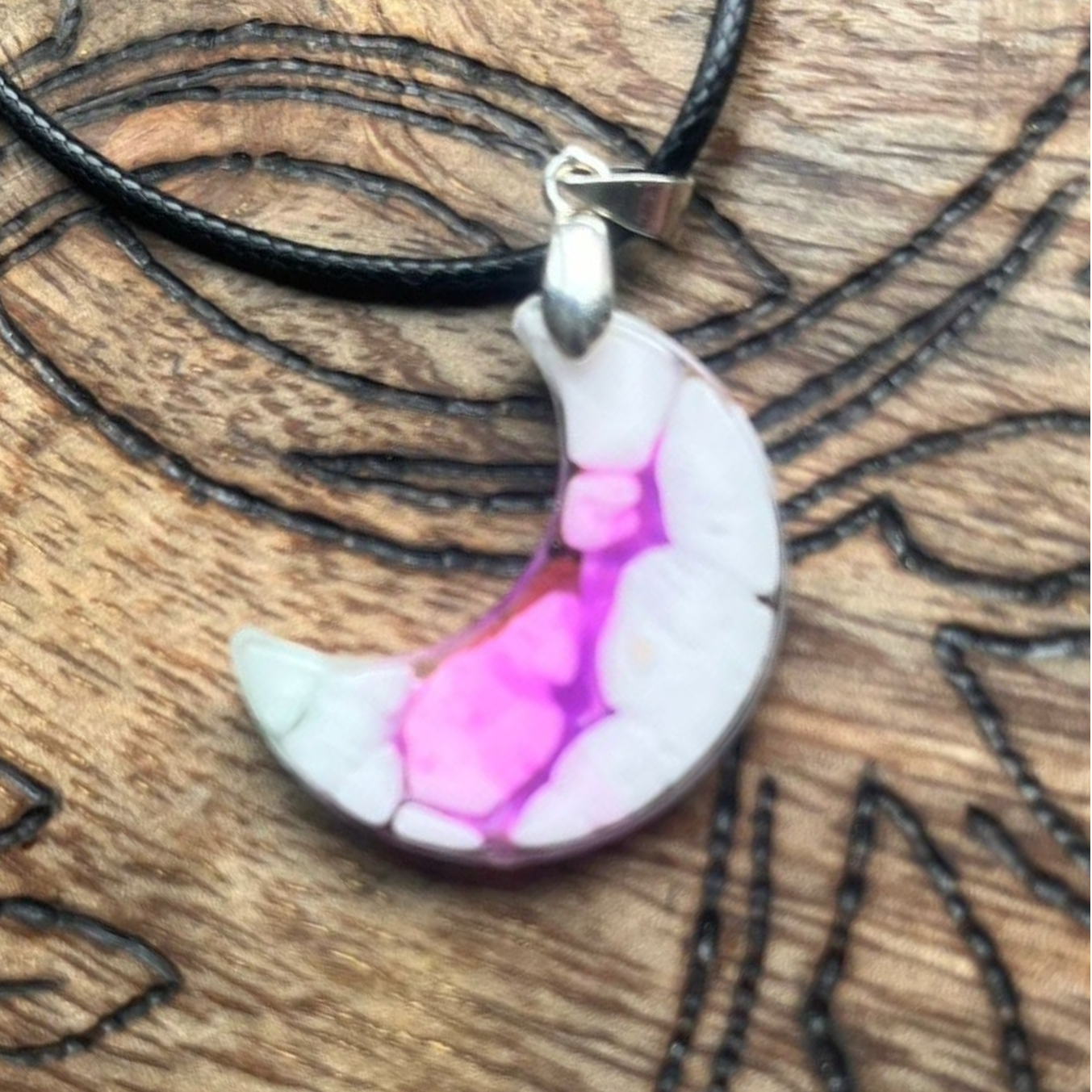 - Zilverkleurige hanger/zilverkleurige sluiting met zwart koortje