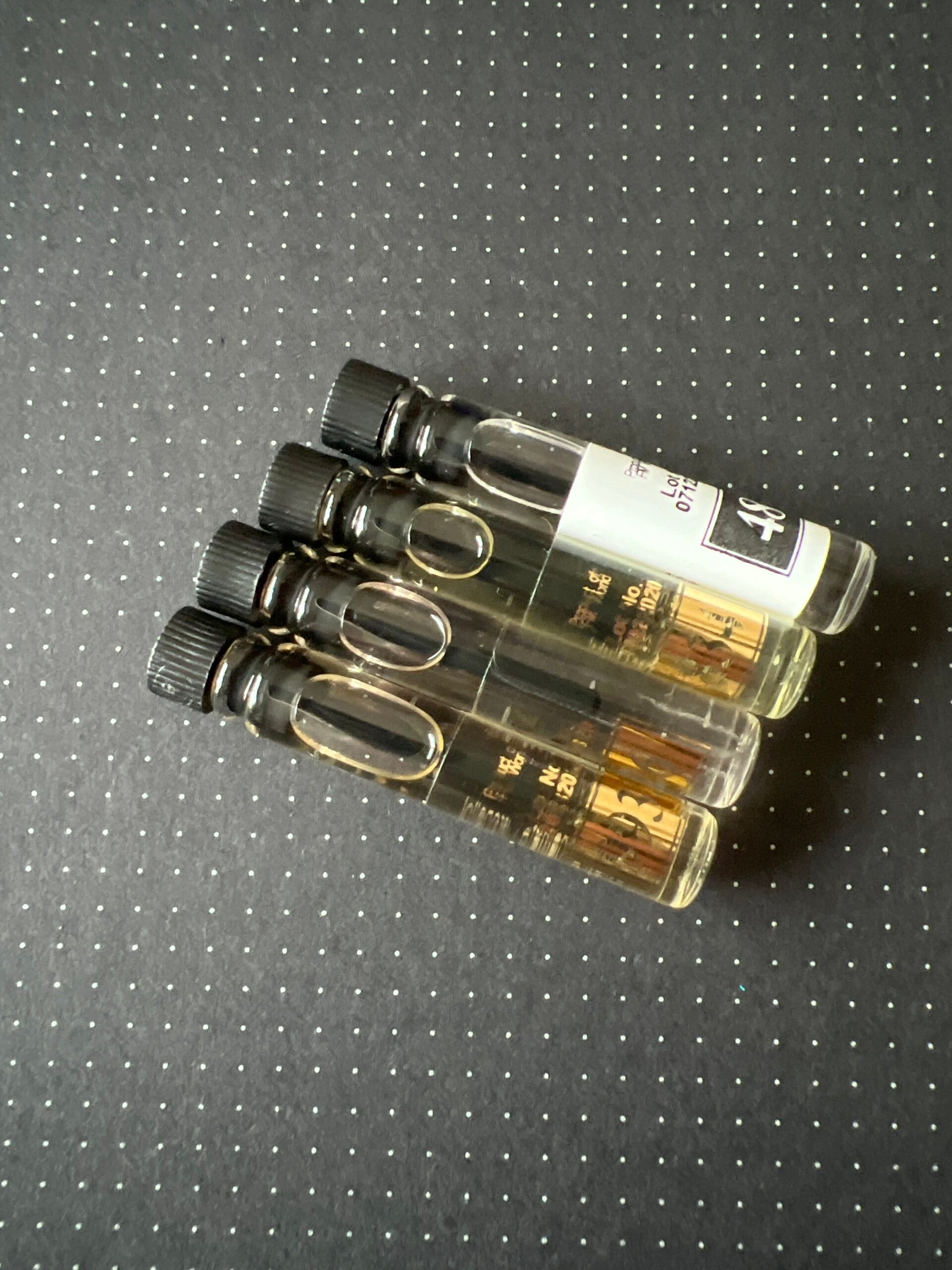 Vier willekeurige oriëntaalse parfums, elk met een eigen karakter